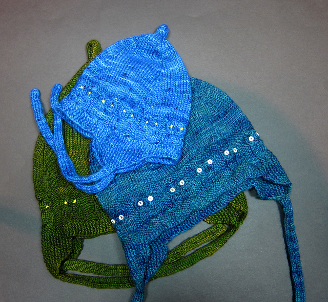 Flappy, an owl hat with earflaps, in a multitude of sizes by Rachel Maurer has owls all around the hat with tiny little button eyes sewn on. It's made with one skein of sock yarn, 26 sts= 4 in gauge on a size 3 and 2 needles in baby, toddler, child, adult sm, med and lg sizes is a free owl hat pattern on Ravelry.