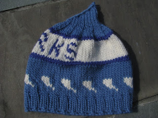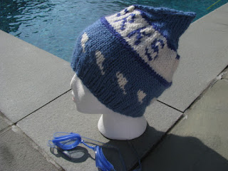Since this is a swim team cap, more than a simple beanie, it had to be warm and cozy for after swim meets when their hair is dripping wet and it's chilly outside. This one was knit with Valley Yarns Berkshire Bulky (wool/alpaca) from Yarn.com with a shark tooth colorwork design around the bottom, complete with a dorsal shark fin top. This original knitting pattern will do for moms, dads, children, and teens. Different tops can be knitted in with every color of the rainbow.