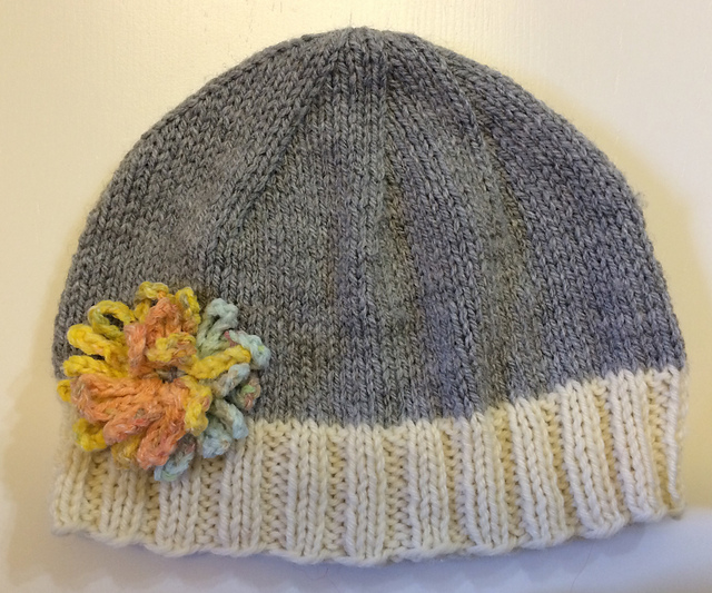 It looks as though, this knitter has either crocheted a chain using a bit of variegated yarn, or if knitting, cast on and cast off one long chain of yarn to make the cute little flower embellishment for the girls' baby hat.